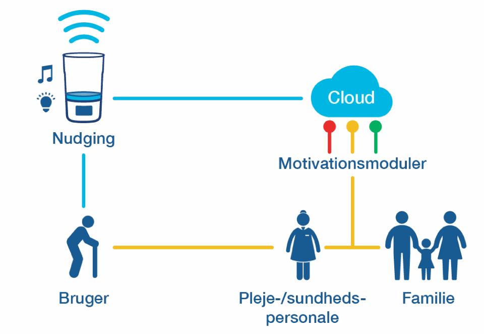 Glassets sensor registrerer, hvor længe der går fra påfyldning til indtagelse, og sensoren fraregner endda væske, som bliver spildt eller hældt ud. Al data videresendes automatisk til en cloud-enhed, som plejepersonalet kan tilgå fra mobil, tablet eller computer.